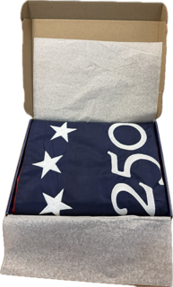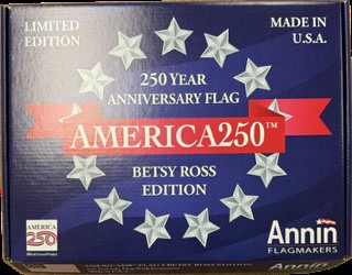 This is an official flag for the 250th celebration of America’s history. This flag is the Betsy Ross flag with the 250 insignia in the star field. The flag has embroidered stars and 250 and the striped are sewn together and made of a densely woven 200 denier nylon material. It is a limited edition and only 10,000 of them are going to be made. Comes with 2 brass grommets and a strong polyester white heading. This will make a great celebratory flag to fly from your house or business to celebrate America’s 250th birthday! 100% made in the USA!