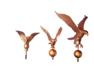 These eagle ornamental flagpole tops are available in three different sizes. They come in 12″ (9″ tip to tip), 15″ (9″ tip to tip) or 27″ (15″ tip to tip)overall wingspan. They are made out of cast aluminum and are finished off with a gold powder coat finish. These eagles would look great flying from the top of any flagpole. Comes with standard national course 1/2″ threads.
