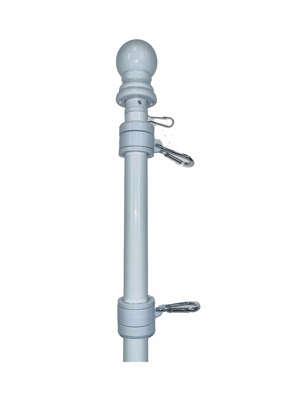 High quality white tangle-free spinning flagpole is bracket mounted and rotates to fly U.S., Military, or Sports team flags. Tangle free flagpole.