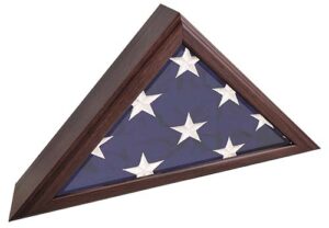 These triangle display boxes are all Made in the USA. Each box is shipped completely assembled with a built-in acrylic glass front panel. Tung oil finish is the final protective coating. A hardwood back panel is easily removed to insert the flag of your choice. The box holds a 5’x9.5′ flag. We recommend a Cotton U.S. Flag to display in these boxes. These boxes are a great way to remember your Veteran and are constructed using quality materials. We have other colors of wood available. Please call us at 800-992-3524.