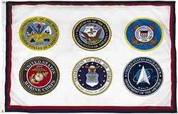 2’x3′ flag of all U.S. Armed Forces seals – Army, Navy, Air Force, Marine Corps, Coast Guard and Space Force on the same flag – made in the USA.